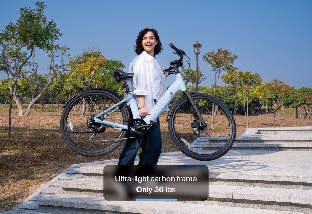 Built with carbon fiber, renowned for its use in Formula 1 and by leading bicycle manufacturers, the Carbon 1 Step-thru e-bike features an innovative low-step frame that not only elevates the bike’s sleek design but also ensures a smooth, reliable, and long-lasting ride. Carbon fiber e-bikes are 50% lighter than aluminum e-bikes, only 36 lbs. making it easier to handle and ride. Its reduced weight allows for quicker acceleration, easier uphill climbs, and smoother turns. Whether commuting through the city or exploring trails, the lightweight design ensures less fatigue and greater control. Enjoy!