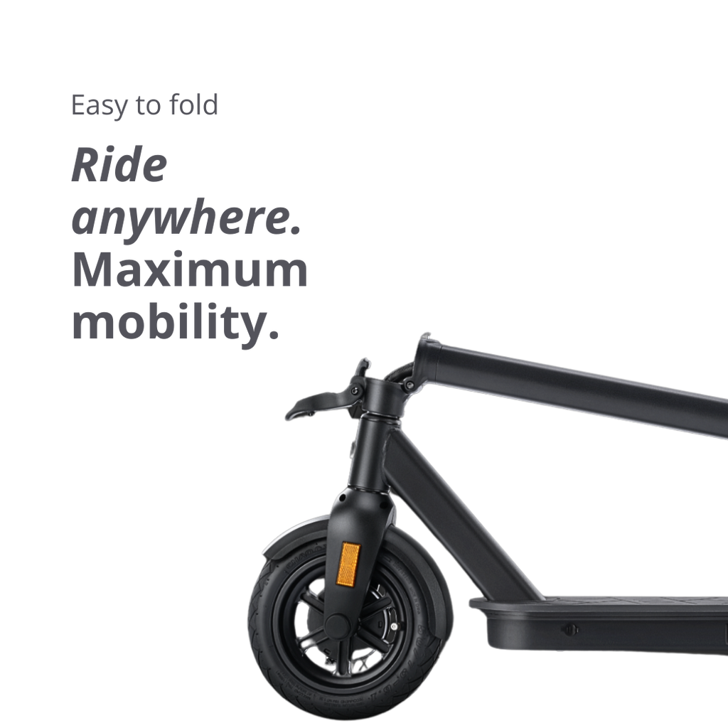 For new electric scooter riders, there is no better place to start than the VMAX VX5 Pro electric scooter. Budget friendly, and easy to ride with a top speed of 17 mph, it’s also our lightest electric scooter with a weight of 35.7 lbs, so it’s easy to bring with you on a bus, train, carry upstairs, or fit into the trunk for last mile commuting. Small and mighty, the VX5 Pro is built for adult riders with a 265lb rider weight limit, and 840W of peak power, so it out-climbs similarly priced scooters, scaling inclines up to 25% grade. It’s also got adult-sized brakes, out stopping all similarly-priced scooters in independent tests by Electric Scooter Guide. Get a VX5 Pro and start riding today!